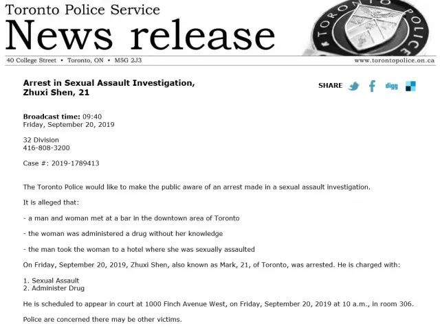 目前,沈朱熙因为性侵和滥用药物两项罪名,已被多伦多警方逮捕。