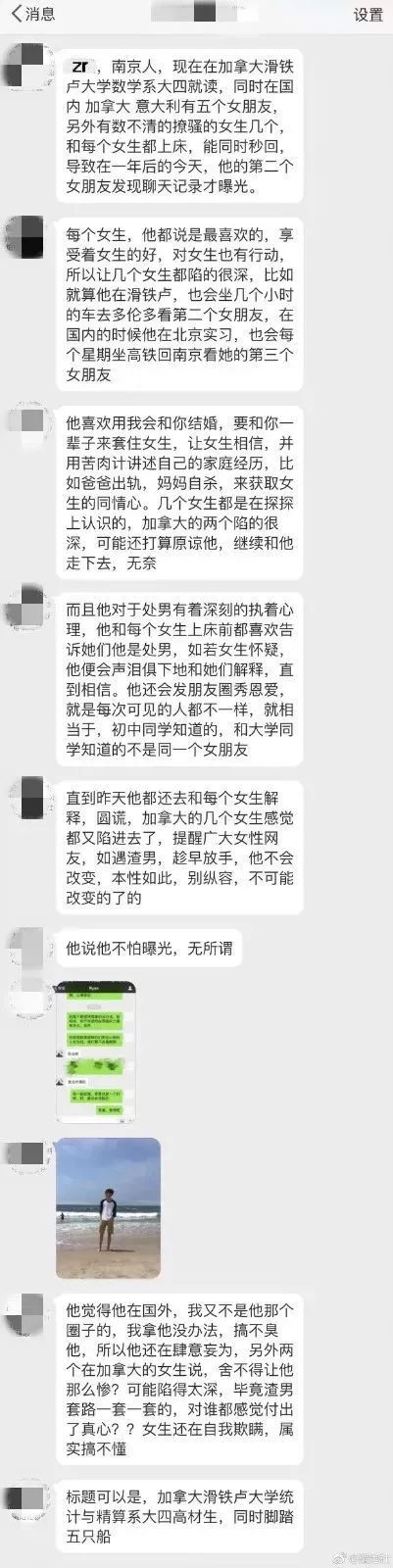 18年3月的时候,有网友在微博上爆料,一名滑铁卢大学统计与精算专业的中国留学生ZR,不仅脚踏五只船,还对每一个交往的女生都说自己是处男。