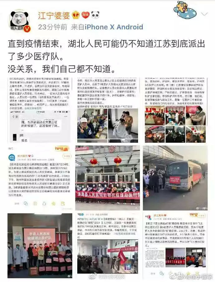 而江苏则有江苏十三太保/苏大强,有网友称,各省往湖北输送物资都是以省为单位,江苏是各个地级市,甚至县级市,还有村……