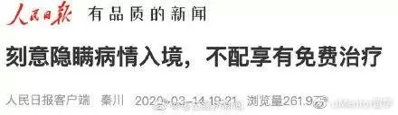 华人回国治疗本身无可非议,只要主动报备主动隔离就行。但最近有不少隐瞒病情的境外回国人士,极不负责任的行为使得国内抗疫的输入性风险增加。其中甚至出现一些蛮不讲理,不配合隔离工作的人。