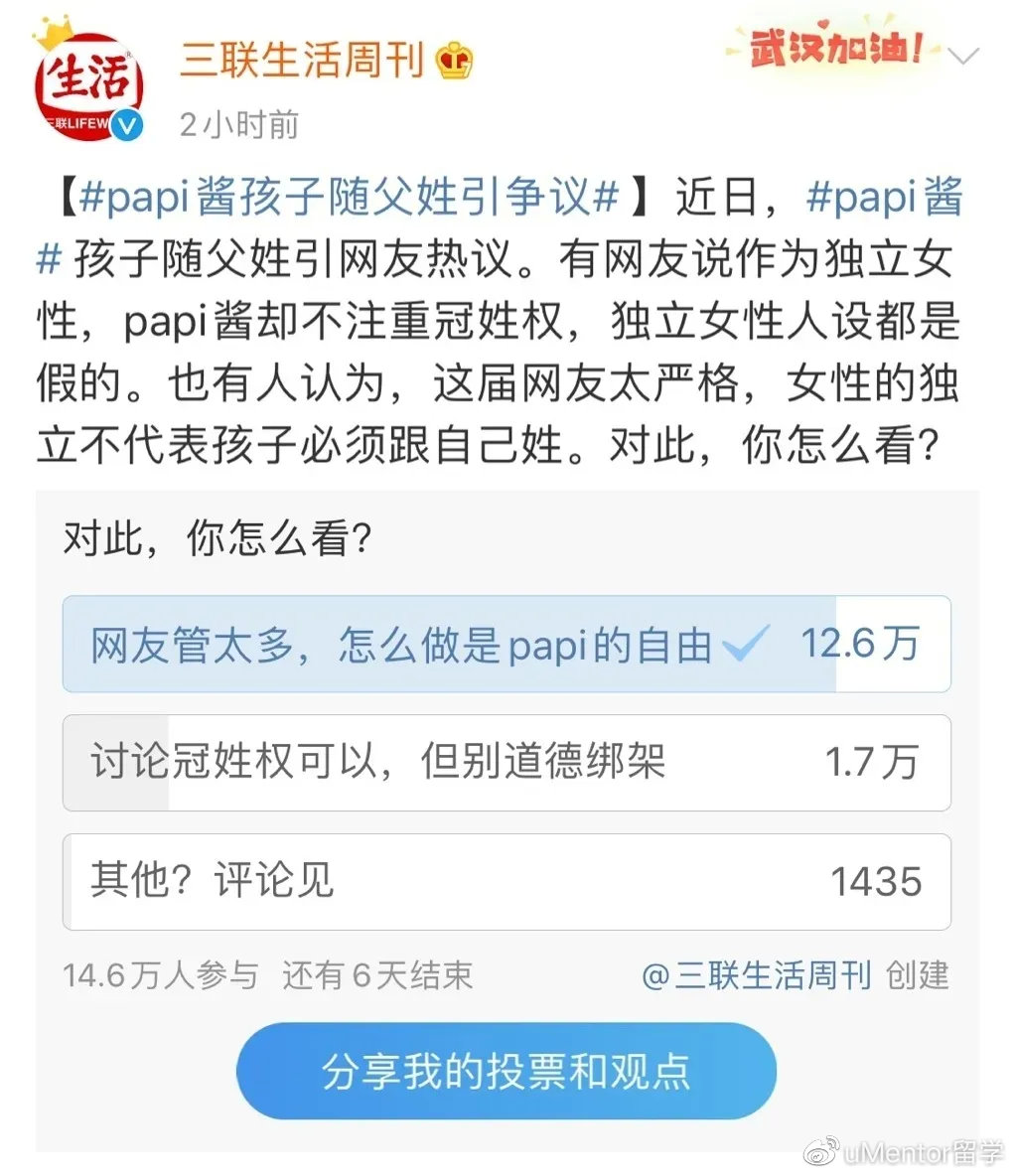 在papi酱被骂上热搜后,《三联生活周刊》发起了一个投票,讨论女性独立不代表孩子必须跟自己姓。