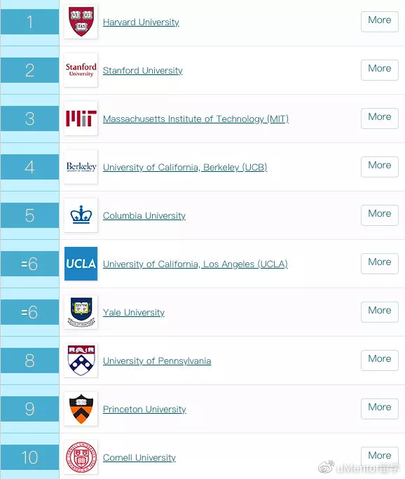 前10被藤校包揽了6所,其余则落在了斯坦福、MIT、UCB、UCLA。