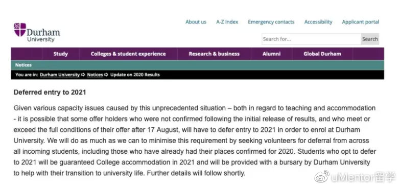 8月19日,杜伦大学(DurhamUniversity)官网上的一份声明中表示:虽然我们“honor the offer”,但如果学生愿意延期一年入学的话,我们愿意给钱!